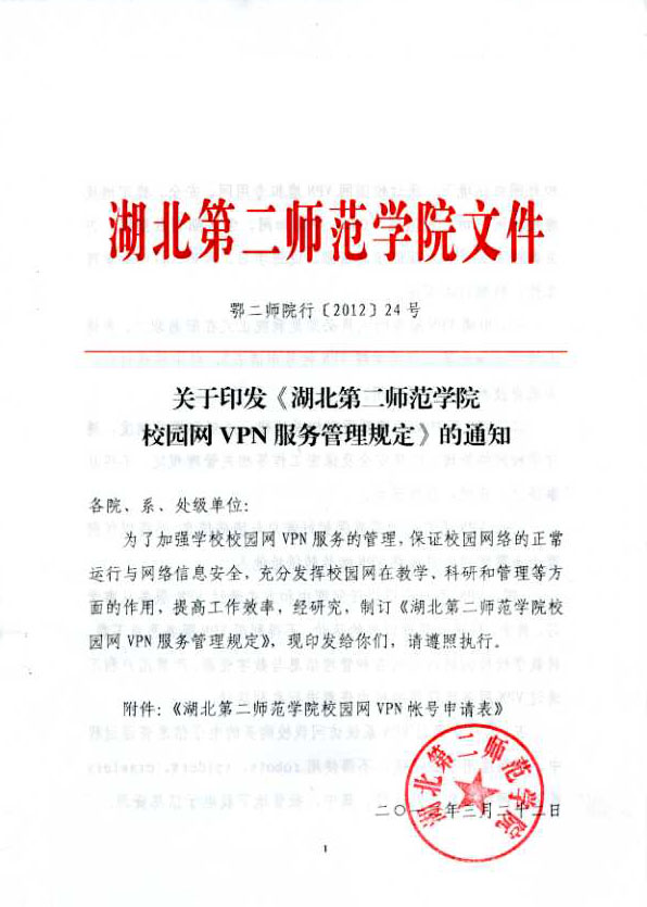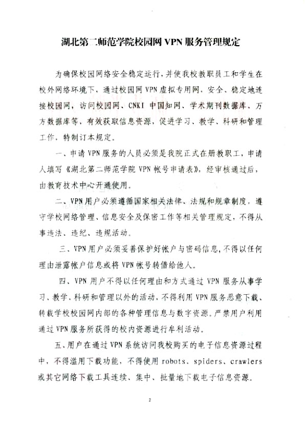 于印发《湖北第二师范学院校园网VPN服务管理规定》的通知