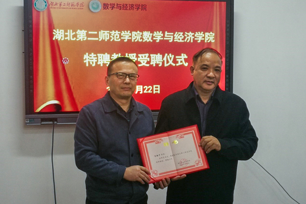 本网讯(通讯员 宋志秀)4月22日下午,学校在数学与经济学院(以下简称:数经学院)研究中心举行特聘教授葛翔宇聘任仪式。副校长夏力出席,数经学院副院长李海雄主持仪式。