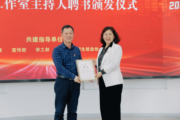 与会领导为学生成长工作室主持人颁发聘书。