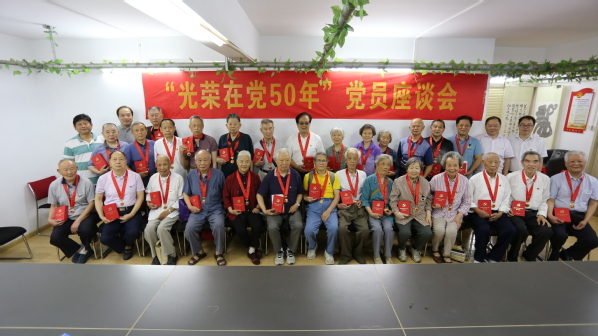 座谈会上,许邦官为参会老党员代表颁发“光荣在党50年”纪念章;大家重温了入党誓词;老党员们回忆了自己的入党初心和在党50年的感悟;与会党员们同唱红歌《没有共产党就没有新中国》。