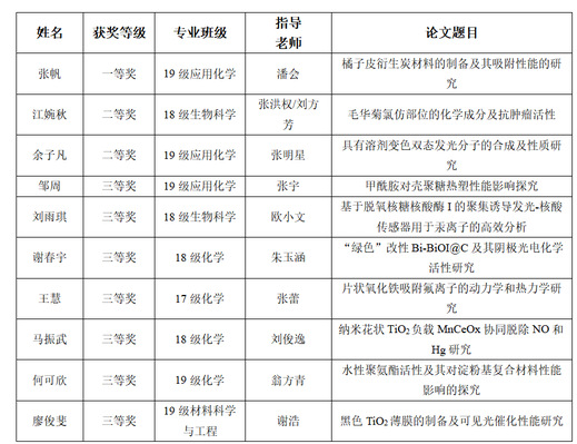 本网讯(通讯员 谭芬)近日,湖北省第十四届大学生化学(化工)学术创新成果报告会在三峡大学举行。我校斩获一等奖1项、二等奖2项、三等奖7项。获奖名单如下: