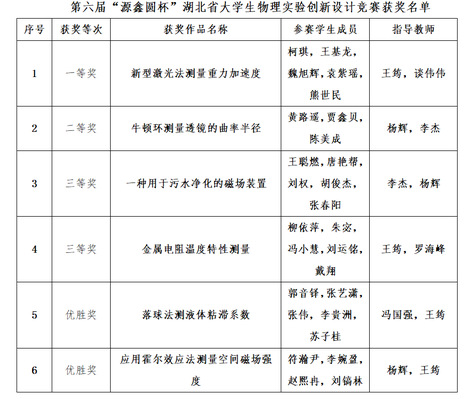 本网讯(通讯员 王筠)7月25日,第六届“源鑫圆杯”湖北省大学生物理实验创新设计竞赛在湖北民族大学落下帷幕,我校获一等奖1项、二等奖1项、三等奖和优胜奖各2项。