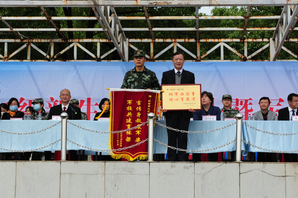 杨玄对2021级新生在军训中所展现的艰苦奋斗、顽强拼搏的精神给予充分肯定。柯美录代表学校与杨玄互赠军训纪念品。