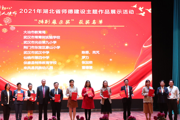 本网讯(通讯员 刘欣 李念文)10月31日,2021年湖北省师德建设主题作品展示活动在我校大礼堂拉开帷幕。湖北省教育厅教师管理处相关负责人,我校副校长、省继教中心主任胡兴;省中小学继续教育中心常务副主任王勇;省教育学会教师教育专业委员会秘书长王祖琴、副秘书长胡松林;湖北长江报刊传媒集团党委书记、董事长肖昌斌,党委副书记、总经理周发秋,党委委员、副总经理张勤、叶凌凯等领导,以及荣获优秀组织奖的11个地市教育局、40家区县教育主管部门和部分学校教师、我校“优师计划”和“行知实验班”师范生代表参加活动。