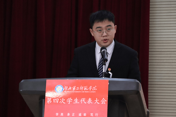 开幕式结束后,大会第一次全体会议召开,学生会主席团成员敖伟昊作了第二十届学生会工作总结及对学生会未来工作的展望。学生会主席团成员张娅辰作了湖北第二师范学院第四次学生代表大会提案工作报告。