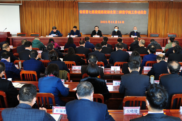 省委第七巡视组组长阮力艰作动员讲话,湖北第二师范学院校党委书记张国秀主持会议并代表学校党委作表态发言。
