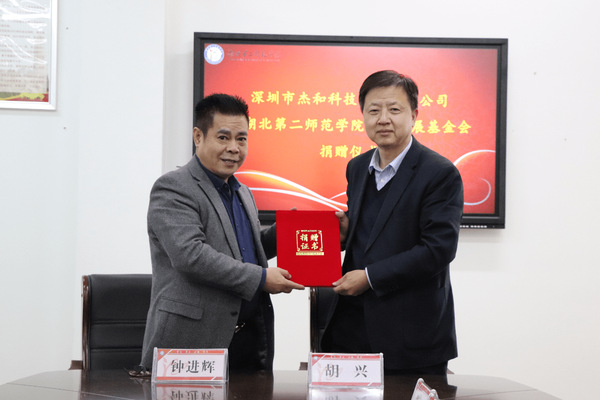 本网讯(通讯员 肖沫晔 李鑫) 11月22日下午,学校在计算机学院会议室举行深圳市杰和科技发展有限公司捐赠仪式。副校长胡兴出席并代表学校接受捐赠。基金会秘书长王正喜主持捐赠仪式。