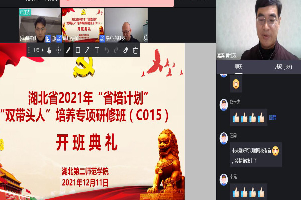 本网讯(通讯员 粟永硕)12月11日上午,我校马克思主义学院承办的湖北省“中小学幼儿园教师素质提升工程”(2021)——“双带头人”培养专项研修班正式开班。湖北省各县市一线中小学100名教师参加线上开班典礼。副校长黄颂出席开班典礼。马克思主义学院院长黄红发教授主持开班典礼。