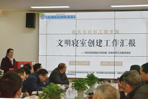 会上,各教学学院从工作成效、问题分析和目标规划三个方面依次进行汇报。通过PPT分享、风采视频、寝室手抄报等方式,展示学院通过文明寝室创建工作,在加强和改进学生思想政治教育、安全教育、学风建设、心灵培养等方面取得的成效。各职能部门负责人作为评委代表进行点评。