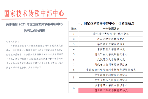 本网讯(通讯员 姚勇)12月23日下午,在2021年国家技术转移中部中心工作会上,我校获评“2021年度国家技术转移中部中心十佳资源站点”,科研处副处长张敏代表学校上台领奖。