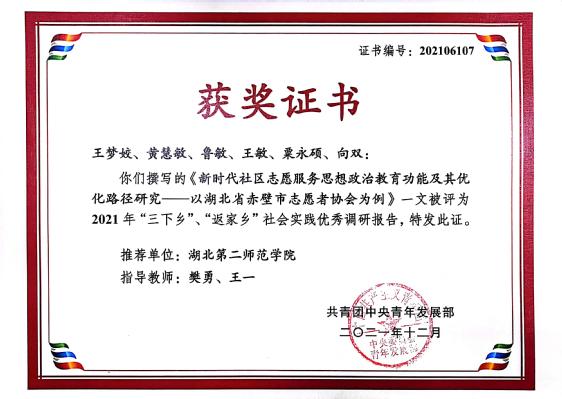 本网讯(通讯员 鲁敏)近日,共青团中央公布了2021年全国大学生“三下乡”“返家乡”社会实践优秀调研报告评选结果,马克思主义学院思想政治教育专业的王梦姣、黄慧敏、鲁敏、王敏、向双、粟永硕等同学共同撰写的社会实践调研报告《新时代社区志愿服务思想政治教育功能及其优化路径研究——以湖北省赤壁市志愿者协会为例》获评全国优秀调研报告。