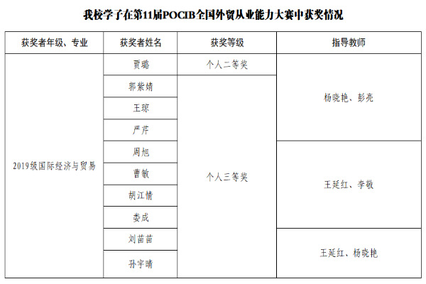 本网讯(通讯员 彭亮)近日,由中国国际贸易协会、全国外经贸职业教育教学指导委员会主办,国际贸易杂志和全国国际贸易实务研究会协办的第十一届POCIB全国大学生外贸从业能力大赛落下帷幕,我校数学与经济学院派出的三支代表队斩获团体二等奖3项,个人二等奖1项、三等奖9项。(编辑 张震)