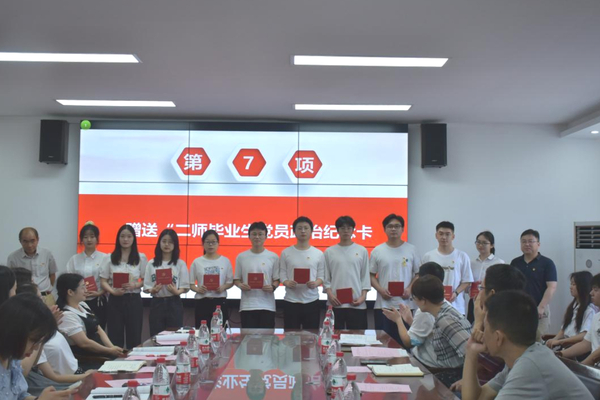 全体党员重温入党誓词、诵读党章;“薪火相传”老党员为新党员佩戴党徽;领导老师为毕业生党员赠送“二师毕业生党员政治纪念卡”;新发展党员代表和毕业生党员代表分别发言。