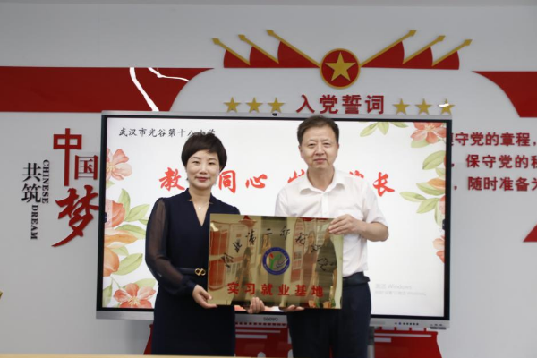 胡兴为“湖北第二师范学院光谷第十八小学实习就业基地”授牌。