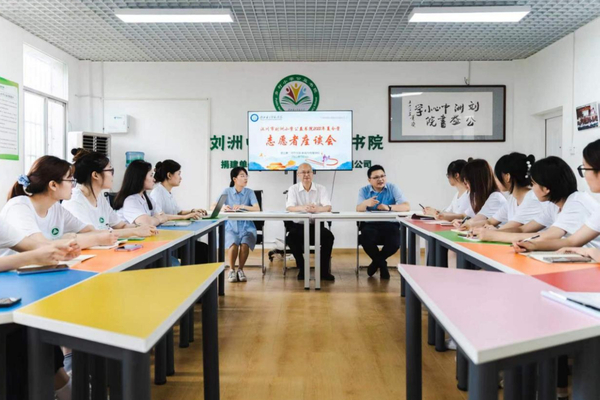 黄颂一行与夏令营志愿者开展了座谈,并就乡村小学公益书院项目工作安排及困难开展交流。