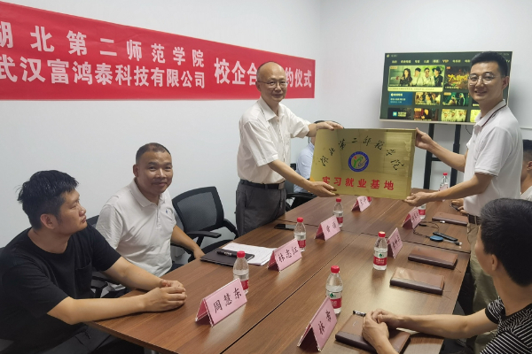 林志红与武汉富鸿泰科技有限公司总经理李升华分别代表校企双方签署校企合作协议。黄颂为“湖北第二师范学院实习就业基地”授牌。