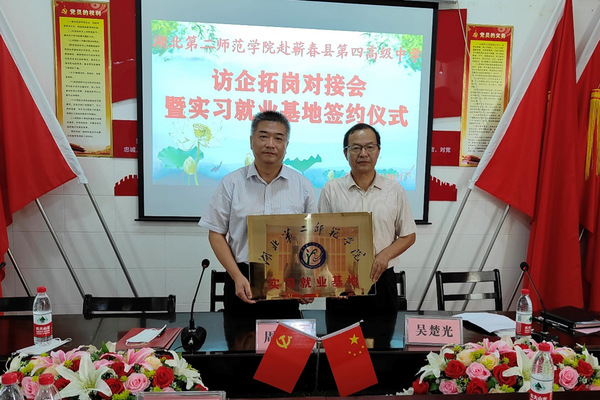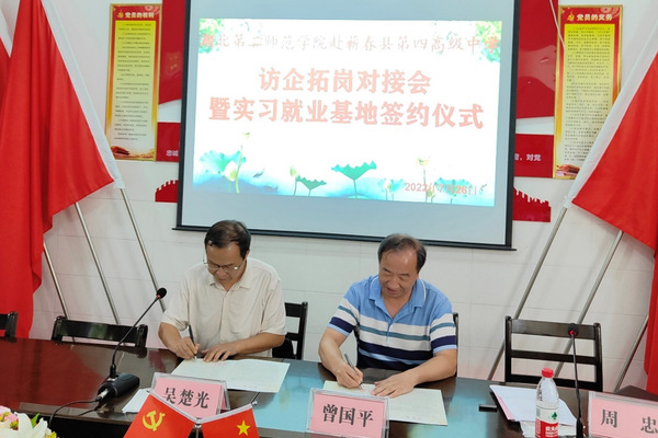 曾国平与两所学校校长分别签订了实习就业合作协议。周忠为两所学校进行教育实习就业基地授牌。