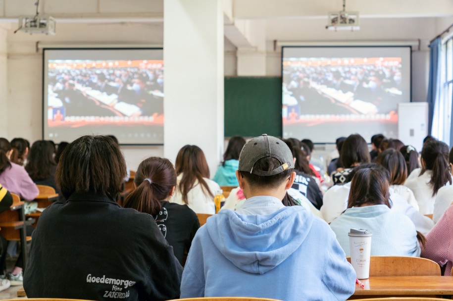 ▲ 文学院、新闻与传播学院师生收看大会直播