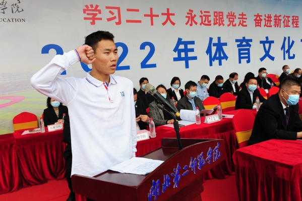 运动员代表物理与机电工程学院杨新召同学、裁判员代表体育学院张梓俊同学分别宣誓。