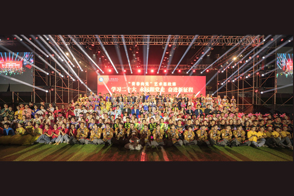 本网讯(融媒体记者 孙玉盈 见习记者 刘雨梦 乐怡然 罗梦瑶)为推动艺术教育和思政教育深度融合,用艺术化形式再现党的伟大精神,11月11日晚,我校在综合运动场隆重举办“学习二十大,永远跟党走,奋进新征程”2022年“青春向党”艺术思政课。全体校领导、各职能部门、各教学学院负责人及2022级全体新生同上一堂艺术思政课。