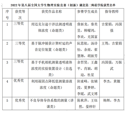 本网讯(通讯员 王筠)近日,在西安交通大学举办的2022年第八届全国大学生物理实验竞赛(创新)结果公布。我校学生共获得三等奖3项和优秀奖2项的好成绩,获奖学生分别来自物理与机电工程学院电子信息科学与技术、光电信息科学与工程和材料物理学等专业。