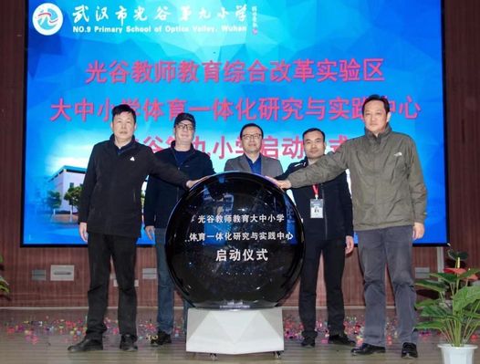 本网讯(学通社记者 吴楚楚见习记者 黄晓程)3月17日上午,“光谷教师教育综合改革实验区大中小学体育一体化研究与实践中心我校附属小学光谷第九小学”在武汉市光谷第九小学(以下简称光谷九小)体育馆举行启动仪式。东湖新技术开发区教育发展研究院李宏斌,光谷九小校长饶家伟,我校党委常委、副校长夏力出席活动,光谷九小党群服务中心主任鹿瑶主持仪式。