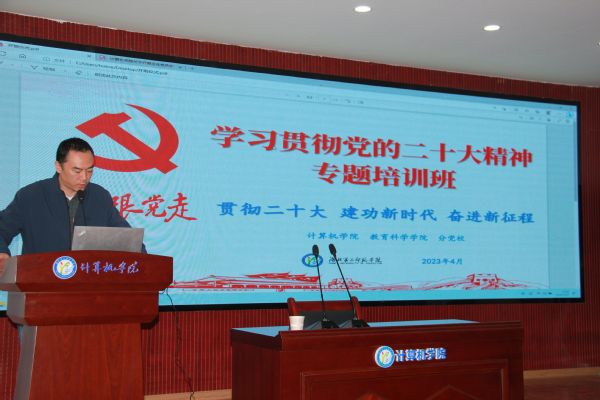 本网讯(通讯员 任京 梅一峰)4月27日下午,由计算机学院、教育科学学院分党校联合举办的“学习贯彻党的二十大精神”专题培训班在实验楼S4210举行。校党委副书记胡兴出席开班典礼并作主题报告,计算机学院、教育科学学院领导班子、全体党员教师参与学习。