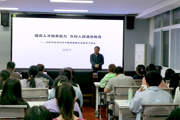 田恒平以《提高人才培养能力,办好人民满意教育》为题,系统为同学们阐述了习近平新时代中国特色社会主义思想的主要内容和深刻内涵,着重就习近平总书记关于教育重要论述的时代背景、重大意义、核心思想、战略部署、工作目标以及思想方法进行了阐述。