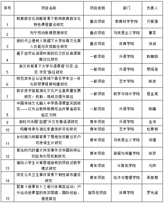本网讯 (通讯员 刘菲)近日,湖北省教育厅公布了2022年度省教育厅哲学社会科学研究项目、专项任务项目(高校学生工作品牌)立项名单和2019-2021年度湖北省高等学校哲学社会科学研究优秀成果入选名单。我校有19个项目获立项资助,2项科研成果入选优秀成果。(新闻中心编辑 程丽鹃)