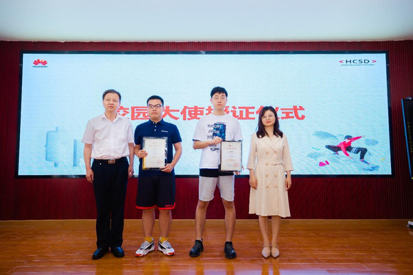 活动现场,22级计算机科学与技术专业翁佳航、20级计算机科学与技术专业吴汉钦当选为湖北第二师范学院华为云校园大使,胡兴、范林芳为优秀的校园大使颁发证书。