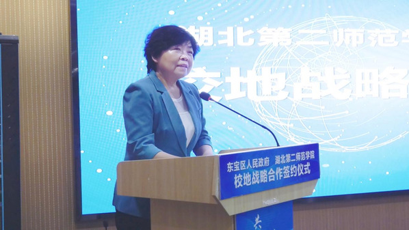 签约仪式上,杨鲜兰对学校发展历史沿革、办学特色进行了介绍。她表示,服务地方发展战略、推动区域经济社会发展,是学校的重要职责使命,学校将以此次签约仪式为契机,本着“资源共享、优势互补、互惠双赢、共同发展”的原则,依托自身智力、科技和人才优势,与荆门市东宝区在人才培养、科技创新、城市建设、社会治理等方面开展深层次、全方位合作,凝聚共识、共谋发展,不断丰富合作形式,增强合作实效,促进校地合作相连相通,为推动学校和荆门市经济社会高质量发展作出积极贡献。