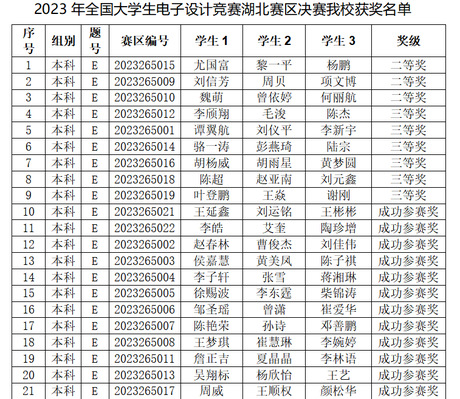 本网讯(通讯员 冯国强)近日,2023 年全国大学生电子设计竞赛湖北赛区(TI杯)决赛落下帷幕。我校物理与机电工程学院学子组成的22支队伍参加了比赛,经过四天三夜奋战并取得了优异的成绩,获湖北省二等奖3项、三等奖6项,成功参赛奖12项。