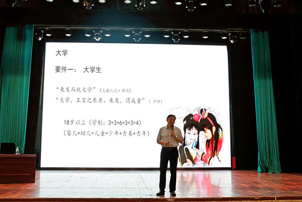 田恒平向全体新生简要介绍了世界和中国大学教育发展历程,详细介绍湖北第二师范学院的办学历史、办学特色、办学成果,让同学们对中国大学的发展历史、内涵建设、在校大学生的规模及面对的社会竞争力有了宏观的了解。同时,也增进了学生对湖北第二师范学院的了解和对学校的归属感,树立大学生意识和主人翁意识。
