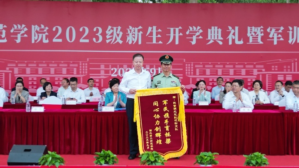 罗胜根代表承训部队发言。校党委副书记胡兴代表学校向罗胜根赠送锦旗。教育科学学院范丹红教授、2023级建筑与材料工程学院谭潇同学分别作为教师代表和新生代表发言。