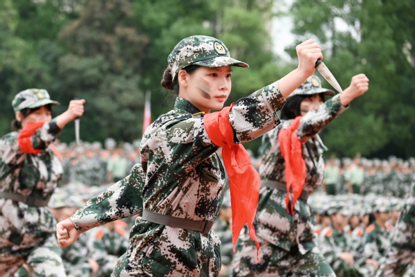 在军事技能表演中,擒敌连方阵、匕首操方阵、教官军事训练、摆字方阵依次进行了精彩展示,现场反响热烈,欢呼不绝,掌声不断。