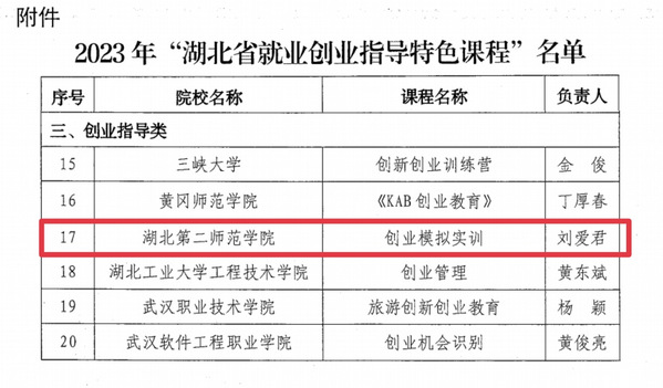 本网讯(通讯员 胡语馨)10月8日,湖北省教育厅公布2023年高校就业创业指导特色课程推选结果,由我校刘爱君老师主讲的《创业模拟实训》课程被评为“湖北省就业创业指导特色课程”。