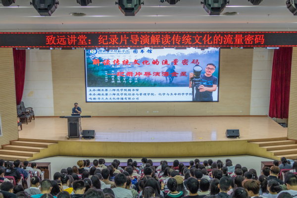 本网讯(通讯员 聂富能 陈雯)从《唐宫夜宴》到《洛神水赋》一系列节目的爆火出圈有目共睹,近年来,许多史料作品凭借独特的“造诣”和背后的故事向大众展现了中华文明的智慧,形成一股“顶流”直冲网络平台的热搜。在这互联网发达的Z世代,如何让更多受众尤其是年轻人爱上传统文化?怎样用传统文化引发出强烈的文化自信呢?10月12日,由校图书馆主办,经济与管理学院、化学与生命科学学院承办的第十三届校园读书节之“致远讲堂——纪录片导演解读传统文化的流量密码”大型讲座活动,在图书馆2号报告厅成功举办,全校近400名师生到场聆听了讲座。著名纪录片导演海金星为本校学子解读传统文化的流量密码,运用纪录片影像的幕后故事,感悟传统文化的精神内涵。
