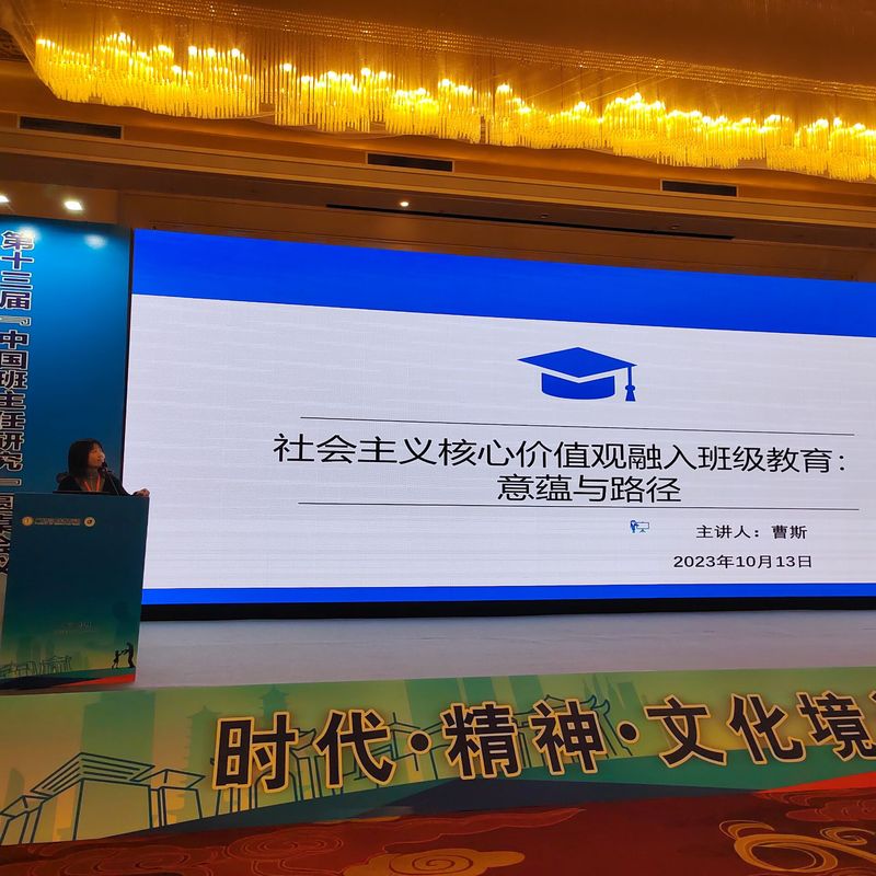 曹斯副教授做了题为《社会主义核心价值观融入班级教育:意蕴与路径》。她指出班级作为学校管理的最基础单位,是践行社会主义核心价值观的主要场所,通过教育引导、文化熏陶、实践养成等环节途径可将其融入到班级日常生活中。
