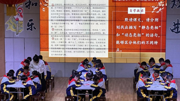 戏曲融合课改展示以音乐教师上戏曲课的模式,由语文老师姜维与三年级同学们为大家带来了戏曲融合课《京剧趣谈——亮相》,武汉市音乐教研员胡晓燕老师在评课中指出,这一节课通过语言的艺术的艺术让学生体会静态和动态的亮相,并且和京歌《唱脸谱》结合,让孩子们跟着视频学亮相、小组创作亮相等设计,让孩子们身临其境感受戏曲魅力、让传统文化走进孩子心里,实现了课堂的提质增效。