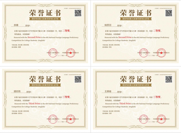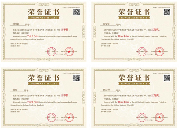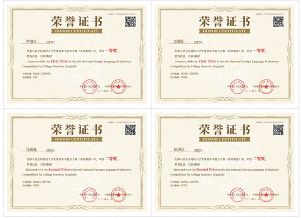 本网讯(通讯员 孙玲燕)近日,第六届全国高校大学生外语水平能力大赛圆满落幕。外国语学院进入决赛的选手们取得了优异的成绩,荣获英语赛道一等奖2项,二等奖4项,三等奖8项。