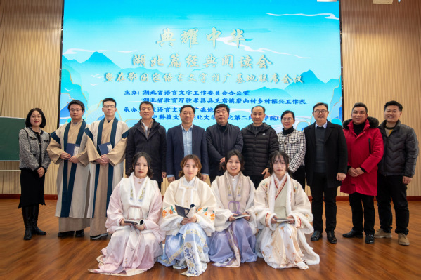 本网讯(通讯员 程文杰)为积极响应国家语委倡导的“典耀中华”主题读书行动,加大国家通用语言文字推广力度,传承发展中华优秀传统文化,1月4至5日,由湖北省语言文字工作委员会办公室、湖北省教育厅驻孝昌县王店镇磨山村乡村振兴工作队主办,国家语言文字推广基地(华中科技大学、湖北大学、湖北第二师范学院)承办的“典耀中华”湖北篇经典阅读会暨在鄂国家语言文字推广基地联席会议在孝昌召开。湖北省语委办、湖北省教育厅驻孝昌县王店镇磨山村乡村振兴工作队、在鄂国家语言文字推广基地、孝昌县教育局、孝昌县清溪实验学校等相关单位领导出席。
