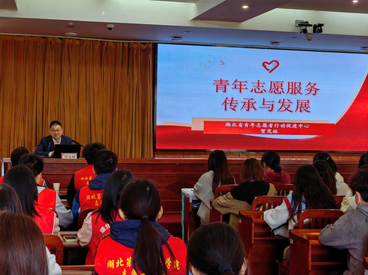 本网讯(通讯员 张锐 李诗涵 张雯)3月21日下午,湖北省青年志愿者行动促进中心负责人、湖北省志愿者协会秘书长贺茂林在行政楼五号会议室为我校“青马工程”培训班学员授课。课前,校党委常委、副校长田恒平会见贺茂林,并亲切交流。校团委书记刘锐主持培训课。