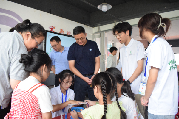 陈勇一行先后来到石山社区和花园社区看望慰问我校文学院星野志愿服务队和新闻与传播学院乡村小学公益书院志愿服务队,并指导开展暑期社会实践工作。在花园社区的“暑假学堂”课堂 上,志愿者带领小朋友们开展“非遗漆扇”特色课程,陈勇和小朋友们一起动手体验,课堂氛围热烈。