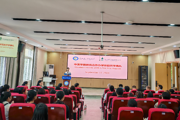 本网讯(通讯员 唐志强)9月27日上午,我校与美国东北州立大学学前教育中外合作办学项目2024级新生开班仪式在1号教学楼1301多功能厅举行。副校长田恒平,美国东北州立大学副校长Dr. Ferrell James Adrian、国际部主任李暄出席活动。