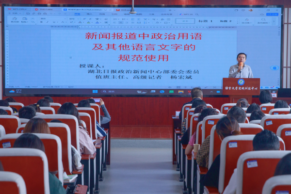 本网讯(学通社见习记者 张雨婷)11月13日下午,学校在1号教学楼301文学剧场举办新闻用语规范与舆论引导专题培训会,邀请湖北日报政治新闻中心党支部委员、部委会委员、高级记者杨宏斌作专题培训。培训会由校党委常委、宣传部部长周忠主持。