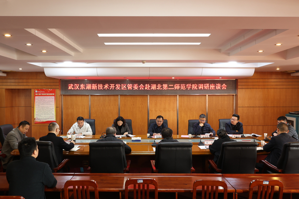 郑军代表学校对徐盛敏一行表示欢迎,并感谢东湖新技术开发区一直以来对学校的关心与支持。他从学校历史、办学规模、办学成果、校地合作、“十四五”校园项目建设、“达标申硕”等方面介绍学校基本情况。他指出,学校根植光谷沃土,与光谷交融共生,要进一步加强与东湖新技术开发区的沟通对接,深化务实合作。希望东湖新技术开发区领导能为学校“把脉问诊”,大力支持学校破解发展难题,实现同频共振、共同发展。他表示,学校也将主动担当作为,更好地服务光谷发展,为中国光谷、世界光谷的腾飞添砖加瓦,贡献二师智慧和力量。