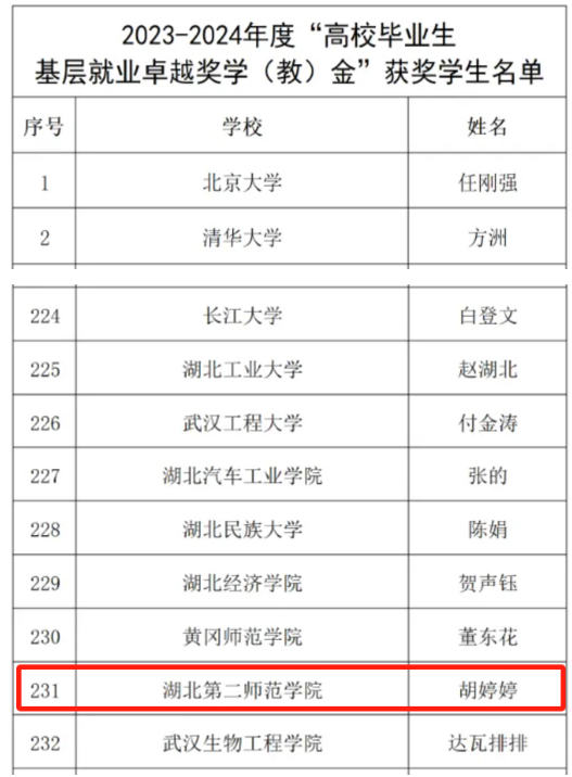 本网讯(通讯员 邹子优)近日,教育部公布《2023-2024年度全国高校毕业生基层就业卓越奖获奖人选名单》,我校外国语学院2019届英语教育专业毕业生胡婷婷获此殊荣。