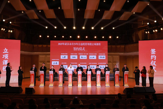 活动现场举行仪式,校团委书记刘锐与华中科技大学、武汉理工大学等10所高校代表共同签约2025年武汉市青少年公益托管重点课程项目。