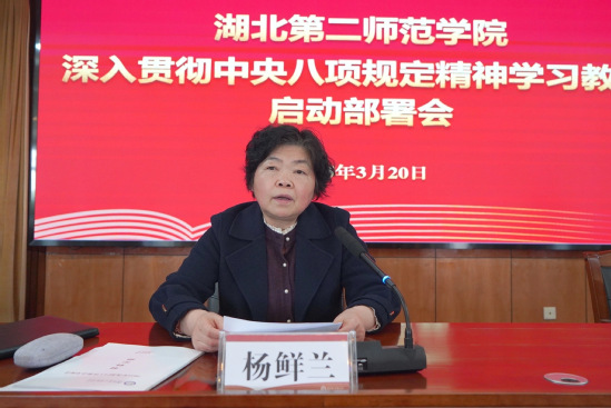 杨鲜兰作动员讲话。她强调,学校各级党组织以及全体党员干部、师生要深刻认识到,开展深入贯彻中央八项规定精神学习教育,是巩固拓展主题教育成果、巩固深化党纪学习教育成果、纵深推进全面从严治党的重要举措,也是以高质量党建引领学校事业高质量发展的内在需求。大家务必坚决贯彻落实党中央决策部署,以实际行动坚定拥护“两个确立”、坚决做到“两个维护”。杨鲜兰提出三点要求:一是提高政治站位,从政治、教育、发展三个维度深化对作风建设战略意义的认识;二是坚持学查改贯通,在“学”上狠下功夫,在“查”上动真碰硬,在“改”上务求实效,推动作风建设不断走深走实;三是强化责任担当,落实全面从严治党主体责任,推进完善治理体系,锻造作风建设长效机制。杨鲜兰着重强调,要以本次学习教育为契机,紧抓内涵建设,办好民生实事,营造风清气正的政治生态,为实现学校高质量发展贡献更大力量。(图片 影像工作室 新闻中心编辑 夏锐)