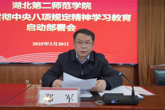 会上,校长郑军传达了《中共中央办公厅关于在全党开展深入贯彻中央八项规定精神学习教育的通知》和《中共湖北省委办公厅印发<关于在全省开展深入贯彻中央八项规定精神学习教育的实施方案>的通知》精神,并对学校学习教育实施方案进行详细解读。